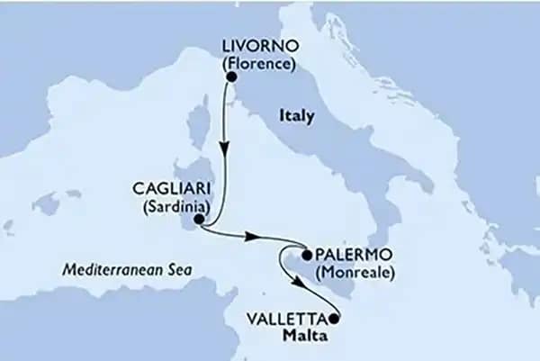 • Krstarenje (4 dana / 3 noći) kruzerom MSC Splendida na relaciji Livorno (Italija) – Kaljari (Italija) – Palermo (Italija) – Valeta (Malta);