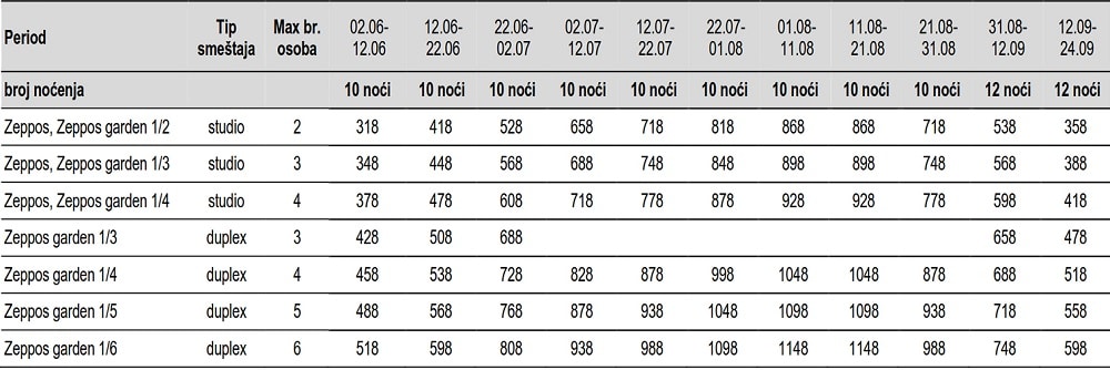 Cene su za najam studija/apartmana za navedeni broj noći i maksimalan broj osoba bez obzira na uzrast. Pored navedenog broja osoba bez posebne doplate i bez sopstvenog ležaja može boraviti dete do 6 godina. Dete starije od 6 godina, a mlađe od 12 godina može boraviti pored maksimalnog broja osoba u apartmanu bez sopstvenog kreveta uz doplatu od 5eur/danu. Postoje kuće u kojima boravak više od maksimalnog broja osoba nije moguć ni uz doplatu. Pored takvih kuća, ovo nije moguće ni u 1/2+1, 1/2+2,1/3+1 ,1/4, 1/5 studijima, 1/4+1 apartmanima, 1/5+1 duplexima.